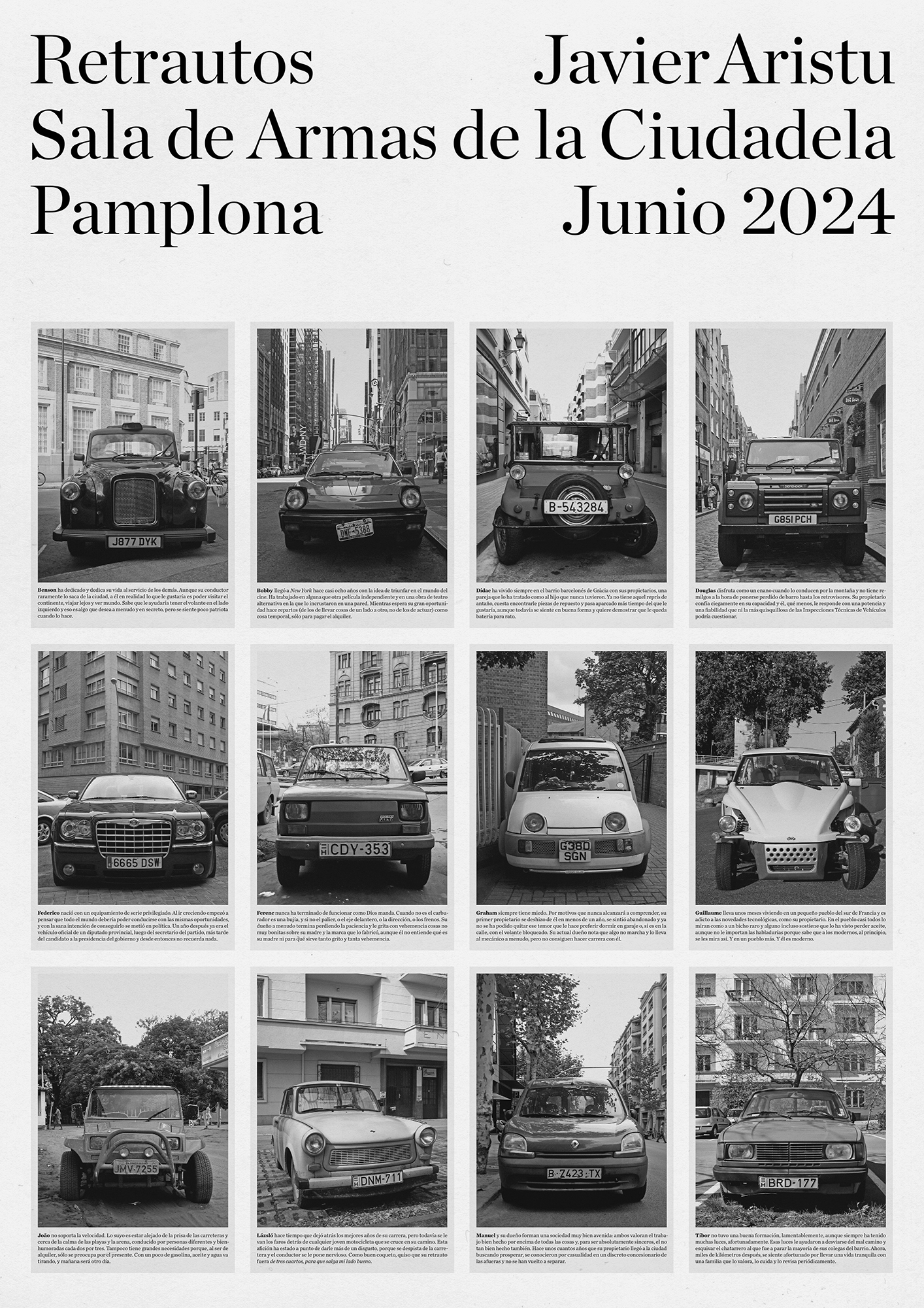 Order now at edicionesenderiz.comThe postcard book includes twelve photographs of automobiles that, accompanied by short stories that imagine a character for each one based on its appearance, become Retrautos; Benson, Federico, Tibor, all have been found by chance in different cities and countries over the years, they raise the extent to which appearance defines and invite us to reflect on identity, diversity and prejudices